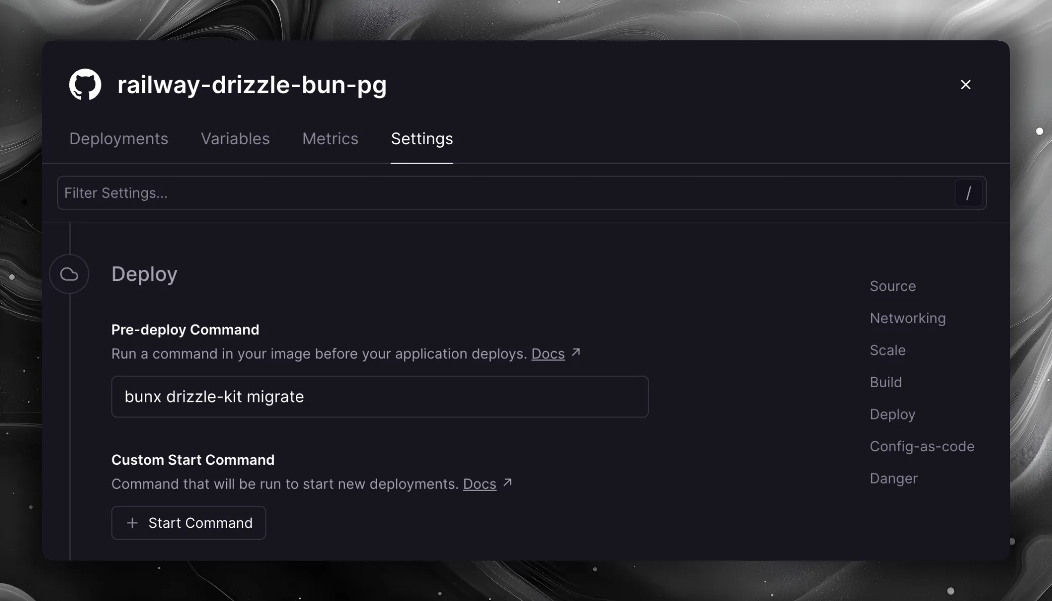 In your service settings, scroll down to the Deploy section and click Add pre-deploy step: