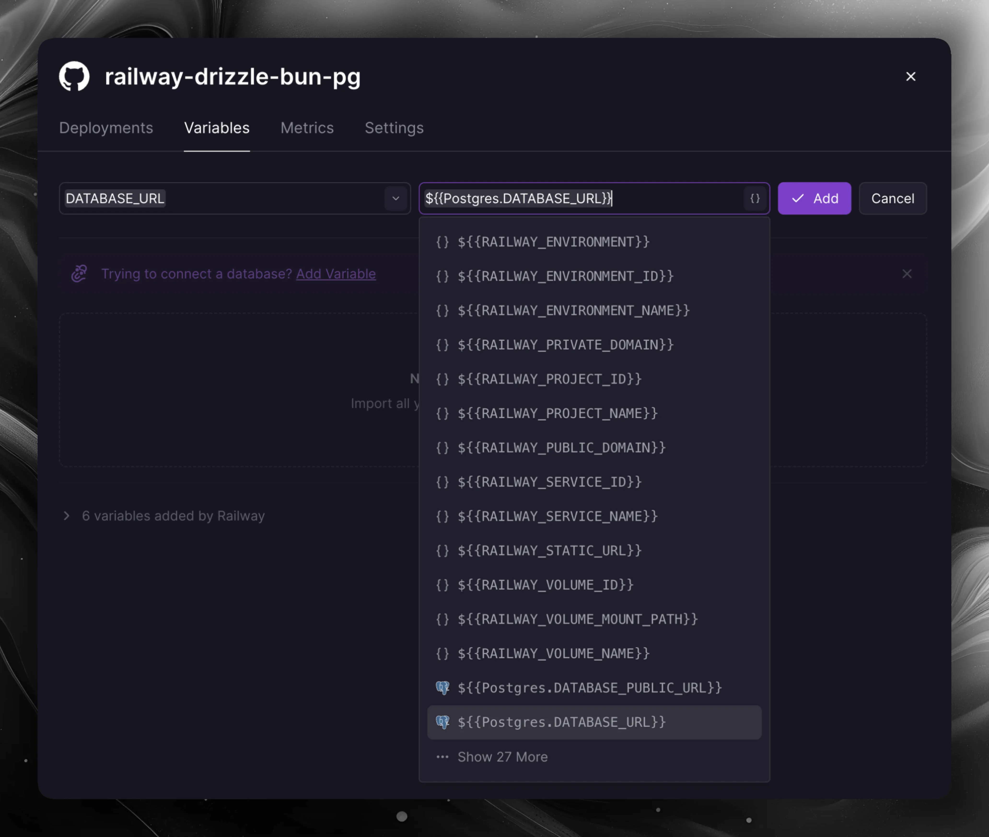 In the deployed service settings, go to the Variables tab. Add the DATABASE_URL variable by referencing the PostgreSQL service variable: