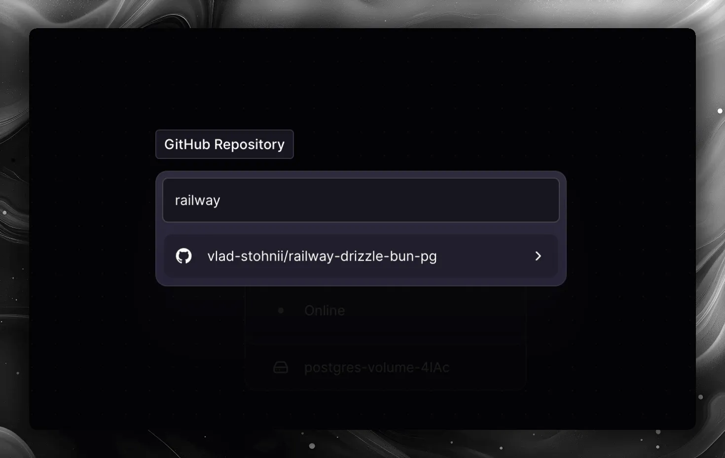 In your Railway project, click the New button in the top right corner of the canvas and select GitHub Repo. Connect your GitHub account if prompted, then select the repository you just pushed.