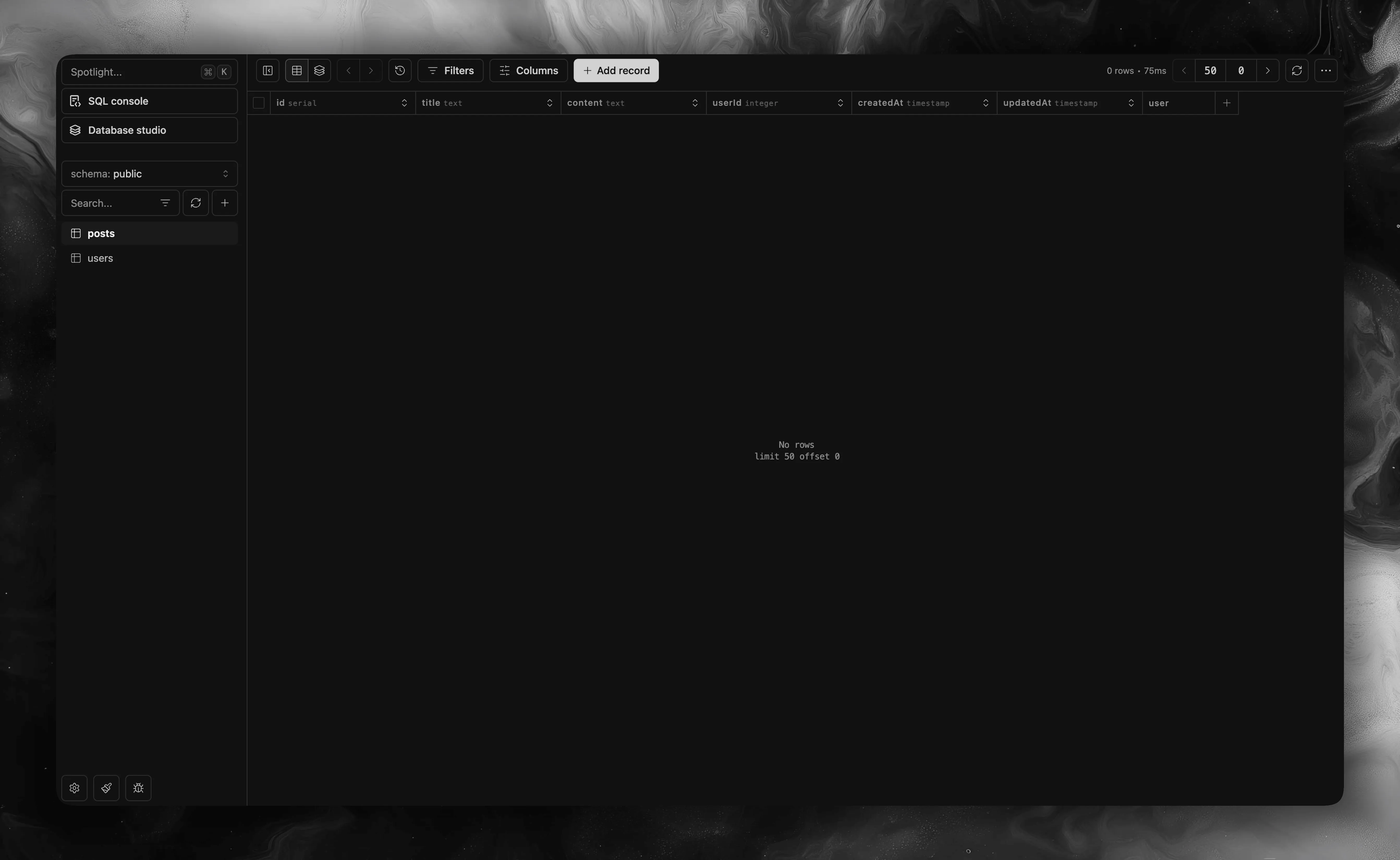 Open the Drizzle Studio URL in your browser. You should see your database tables and can browse, filter, and edit data directly.