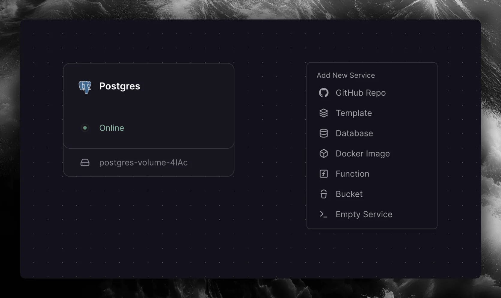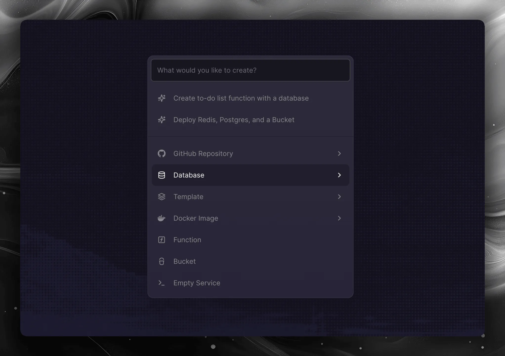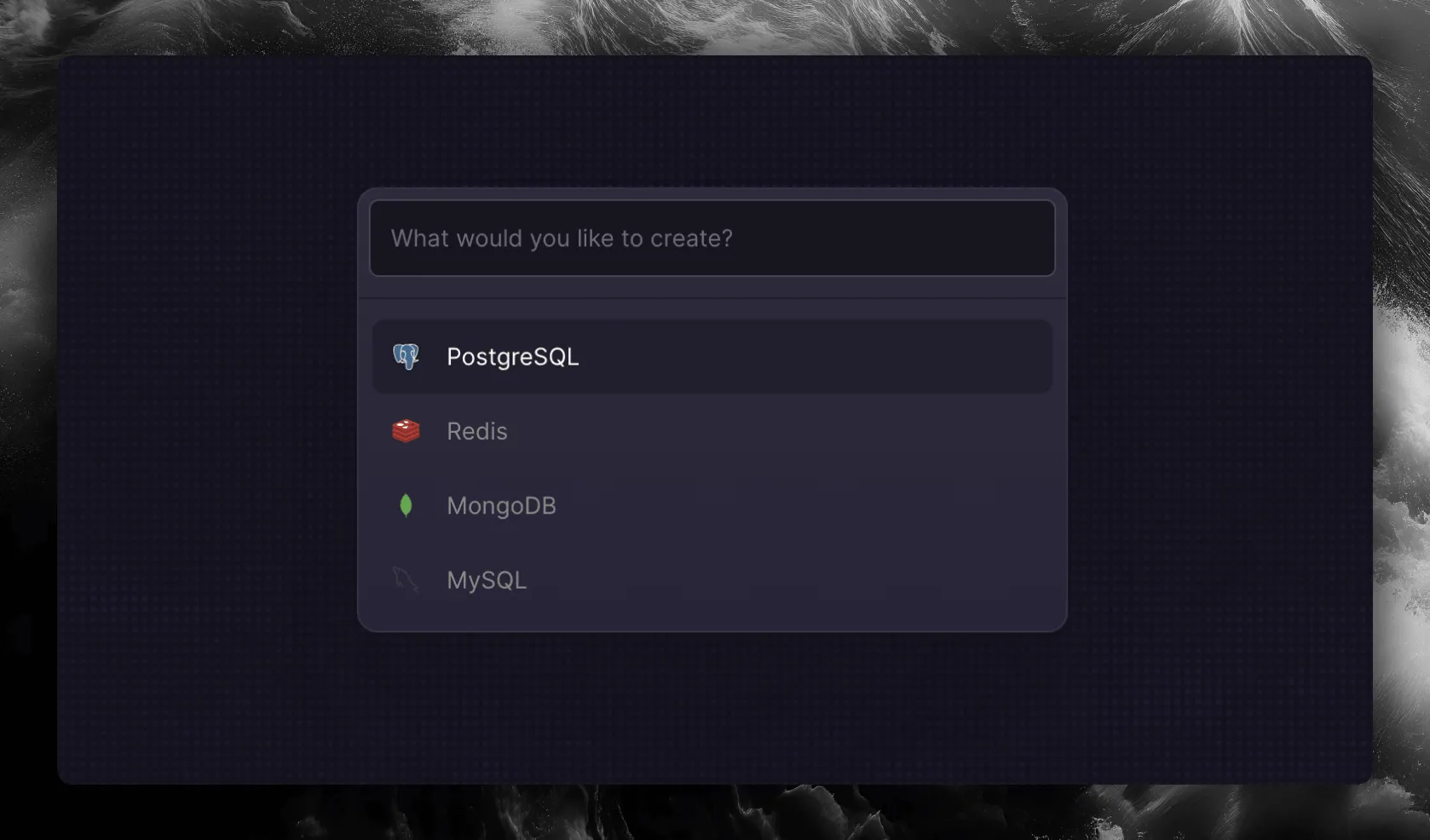 On the project canvas, click the New button in the top right corner and select Database → PostgreSQL. You can also use the command palette (Cmd/Ctrl + K) and search for PostgreSQL. Railway will provision a new PostgreSQL instance for you.