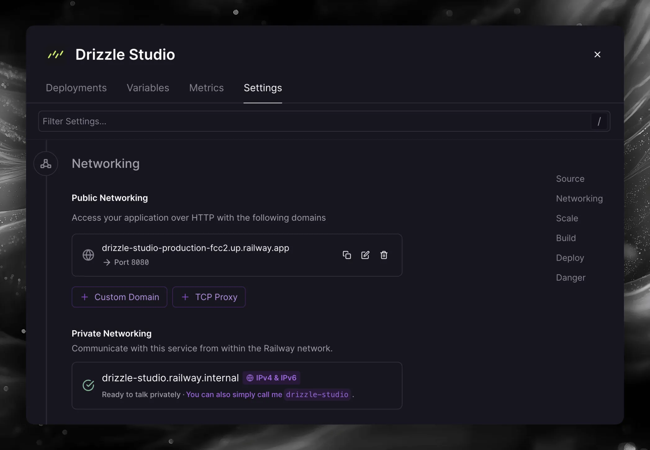 Once deployed, click on the Drizzle Studio service in your project, go to the Settings tab, and scroll down to the Networking section. You will find your public domain under Public Networking.