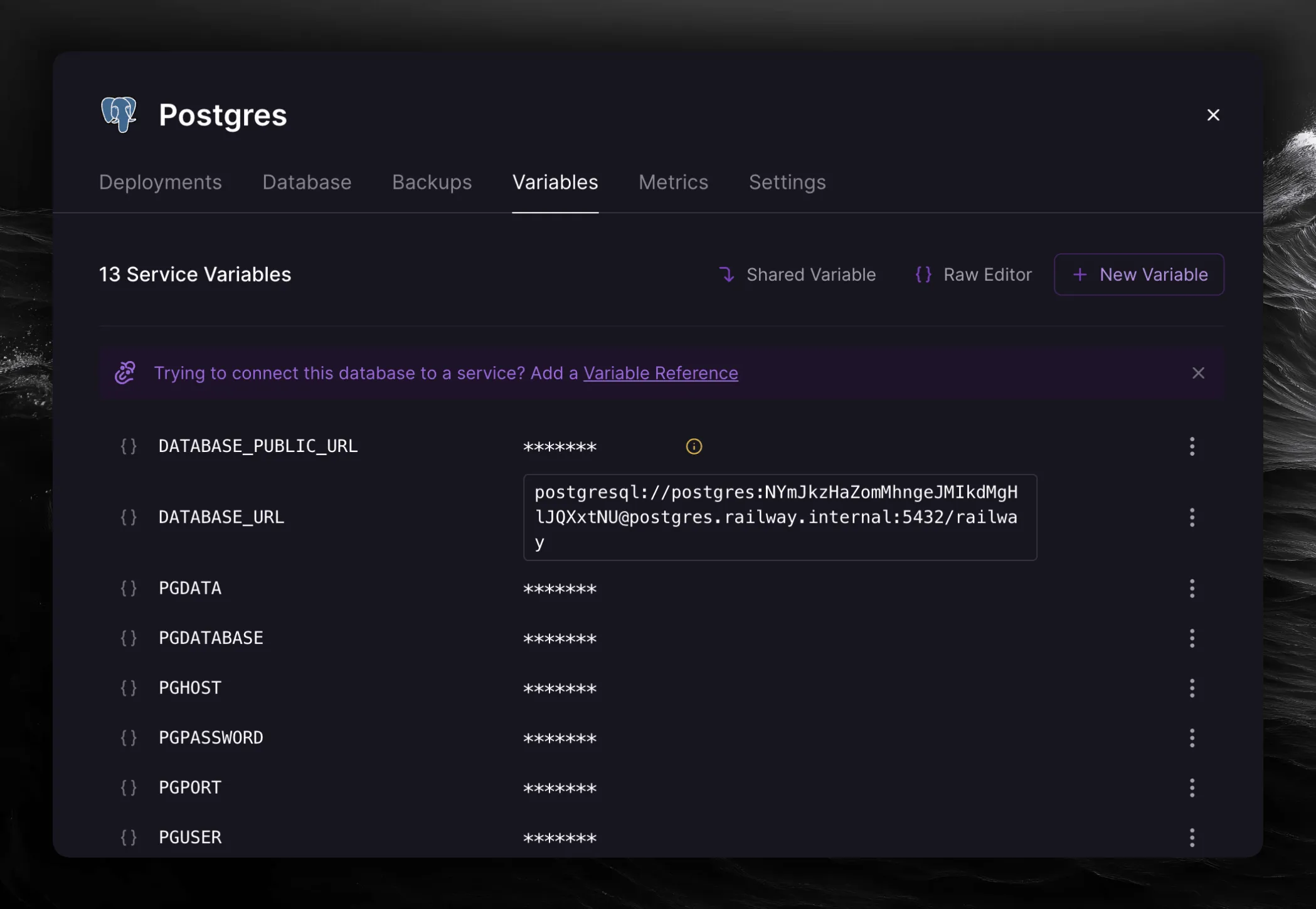 Click on the PostgreSQL service in your project, go to the Variables tab, and find the DATABASE_PUBLIC_URL variable. Copy the value — it should look similar to this: